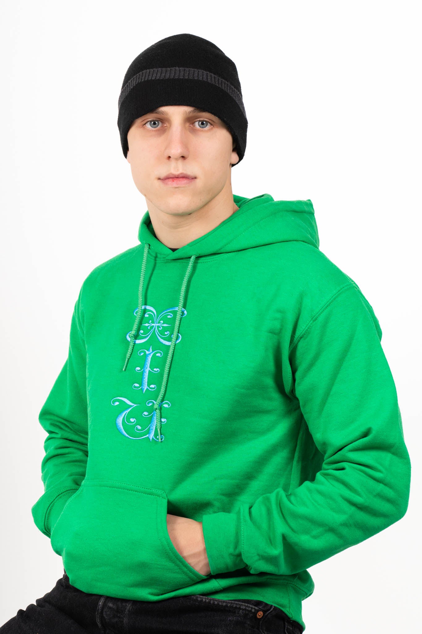All symbols are embroidered on the hoodie. Size L if you like it cozy and size M if you want the hoodie to fit.